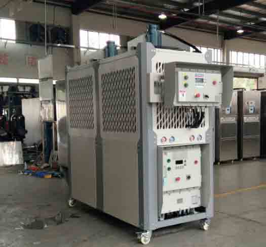 6、水冷式防爆工業(yè)冷凍機(jī)組,通過冷卻塔以冷卻循環(huán)水為冷凝方式的控溫設(shè)備,有箱式和螺桿式;